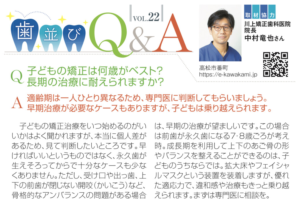 本稿は、地域の情報誌「リビング高松」読者の皆様から頂いた歯並びに関する質問に、当院院長の中村がお応えしている記事を編集部のご厚意で転載しています。掲載は奇数月の最終号です。